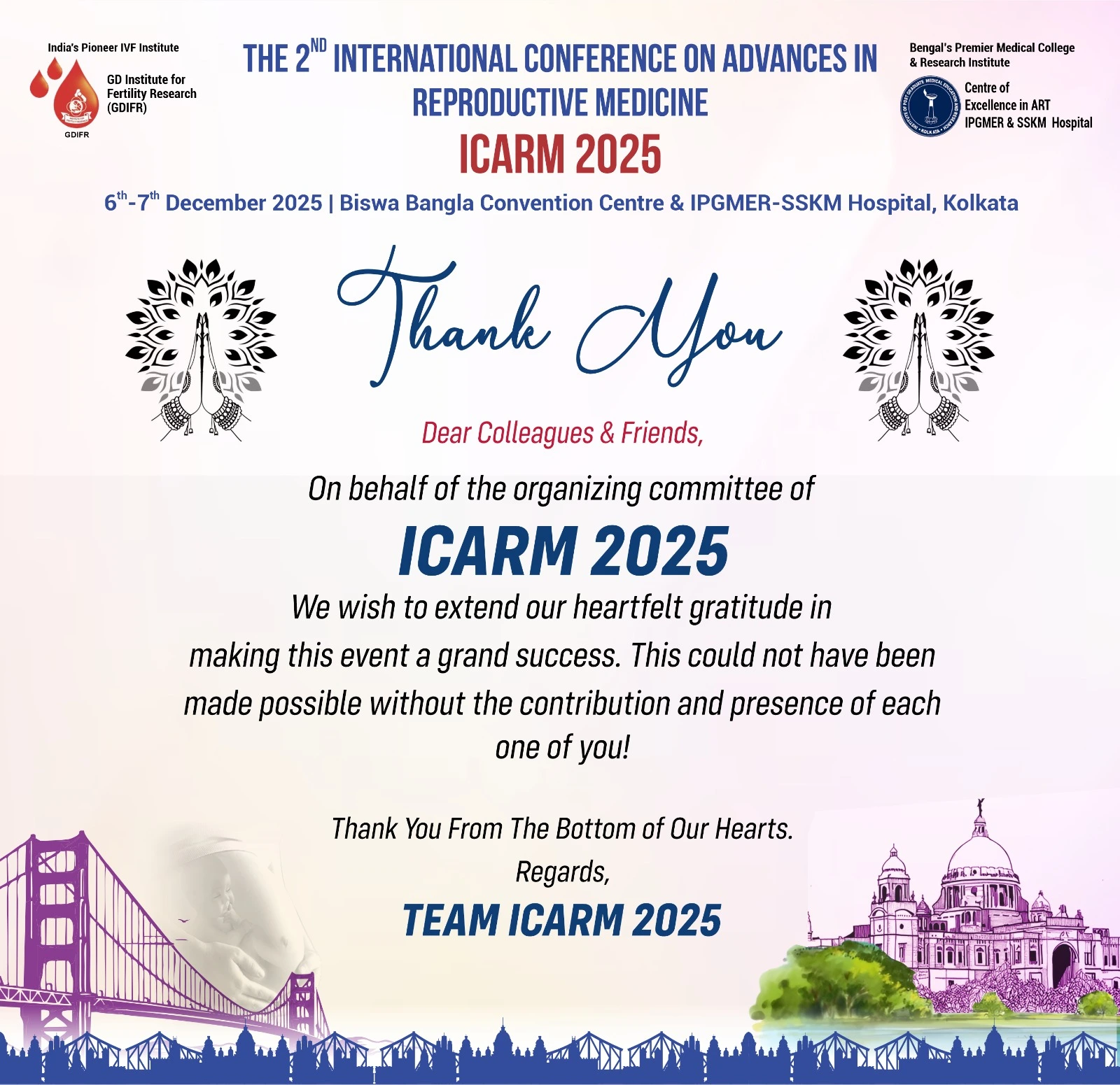It gives us immense pleasure to welcome you to the 2nd International Conference on Advances in Reproductive Medicine, ICARM 2025, to be held on 6th & 7th December 2025 at the Biswa Bangla Convention Centre, New Town, Kolkata, West Bengal, India.